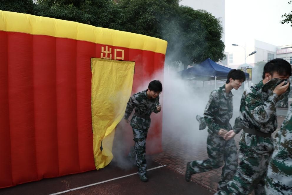 中午14:30,疏散演練開始,學(xué)生公寓模擬起火點(diǎn)開始點(diǎn)煙,火災(zāi)警報(bào)聲立即拉響。各公寓樓從高到低逐層疏散,在引導(dǎo)員的指引下,全體師生用毛巾捂住口鼻,沿著疏散通道采用彎腰低頭的姿勢,有序地疏散至安全地帶。