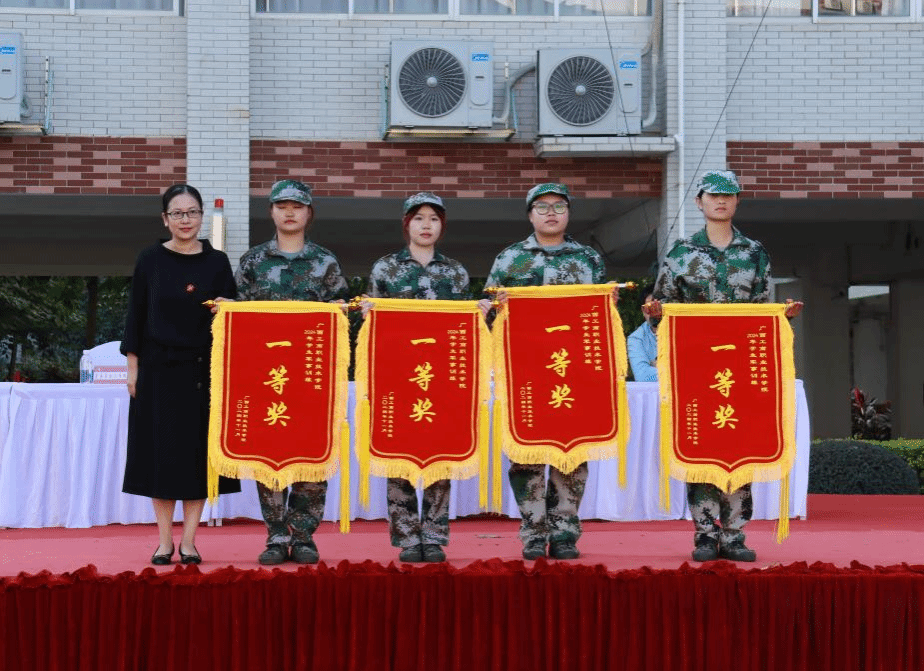 軍訓(xùn)匯演結(jié)束后,良慶區(qū)人民武裝部領(lǐng)導(dǎo)宣布會操結(jié)果。學(xué)校領(lǐng)導(dǎo)、良慶區(qū)人民武裝部領(lǐng)導(dǎo)、各二級學(xué)院有關(guān)負責(zé)人為獲獎班級頒發(fā)錦旗。