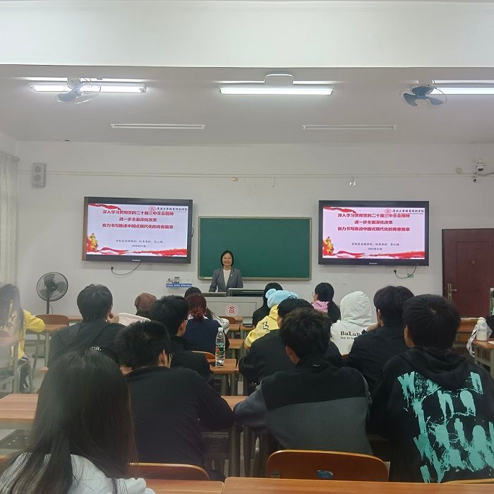 12月6日,學(xué)校黨委副書(shū)記、紀(jì)委書(shū)記韋云鳳深入思政課課堂,以《深入學(xué)習(xí)貫徹黨的二十屆三中全會(huì)精神 進(jìn)一步全面深化改革 奮力書(shū)寫(xiě)推進(jìn)中國(guó)式現(xiàn)代化的青春篇章》為主題,向廣告2410班同學(xué)講授專題課。