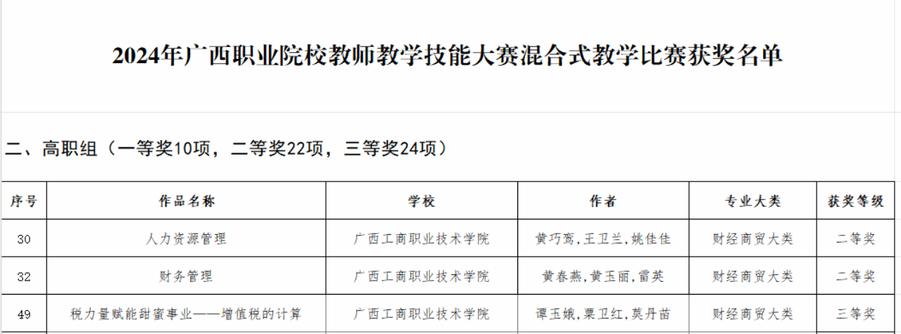 近日,自治區(qū)教育廳公布了2024年廣西職業(yè)院校教師教學(xué)技能大賽混合式教學(xué)比賽及微課教學(xué)比賽獲獎名單,我校教師在比賽中榮獲佳績,共獲一等獎1個(gè)、二等獎4個(gè)、三等獎1個(gè)。