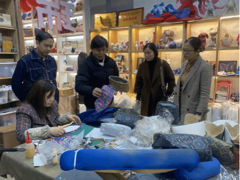 (雙方在壯錦手工基地現(xiàn)場(chǎng)洽談交流)