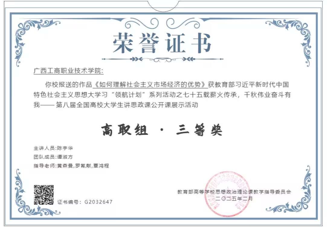 由教育部高等學(xué)校思想政治理論課教學(xué)指導(dǎo)委員會主辦的“七十五載薪火傳承,千秋偉業(yè)奮斗有我”——第八屆全國高校大學(xué)生講思政課公開課展示活動和“我心中的思政課”——第八屆全國高校大學(xué)生微電影展示活動圓滿結(jié)束,我校馬克思主義學(xué)院黃森曼老師團(tuán)隊指導(dǎo)的《如何理解社會主義市場經(jīng)濟的優(yōu)勢》和陶艷蘭老師團(tuán)隊指導(dǎo)的《石牌新韻》2個作品入圍國賽,經(jīng)過角逐,均榮獲三等獎。這是我校第三年獲此榮譽。