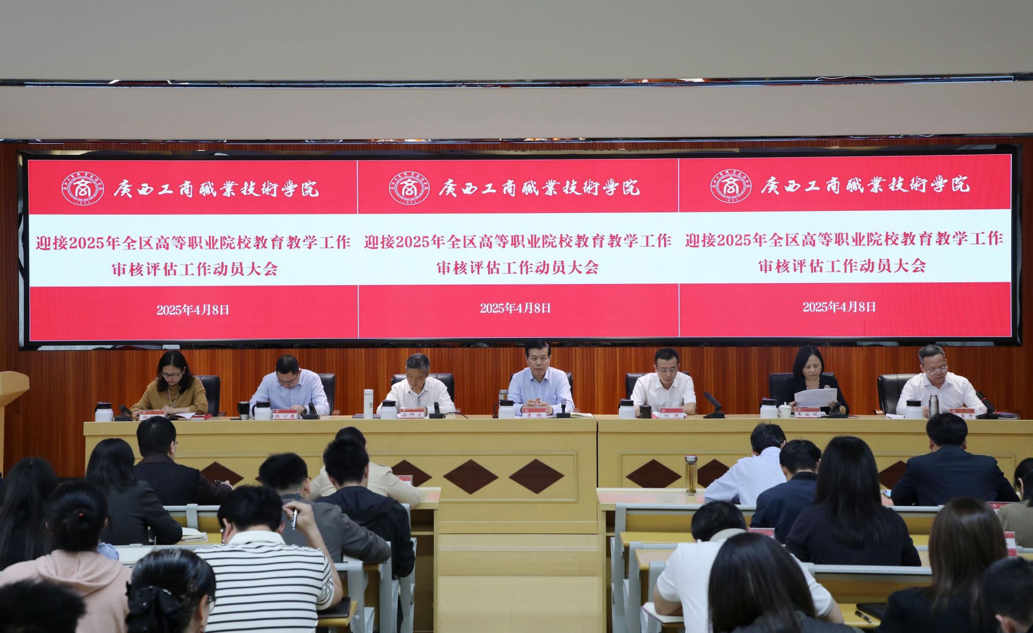 為有序推進我校教育教學(xué)工作審核評估相關(guān)工作,4月8日,學(xué)校在鵬飛校區(qū)召開教育教學(xué)工作審核評估工作動員會,凝聚全校師生員工共識,以教育教學(xué)工作審核評估為契機全力推動學(xué)校高質(zhì)量發(fā)展。學(xué)校領(lǐng)導(dǎo)李維、劉進、安仲文、韋云鳳、陳寧春、闕勇平、鄭華,各部門、各單位主要負責(zé)人、分管工作負責(zé)人及部分教職工在主會場參會,其余教職工在分會場參會。會議由學(xué)校副校長闕勇平主持。