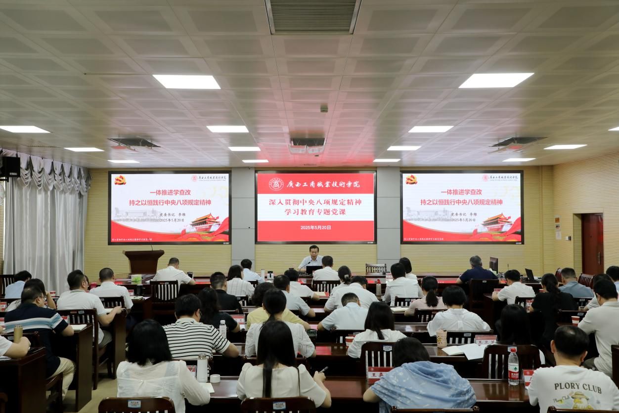 李維書記以《一體推進(jìn)學(xué)查改 持之以恒踐行中央八項規(guī)定精神》為題,圍繞“習(xí)近平總書記關(guān)于加強(qiáng)黨的作風(fēng)建設(shè)的重要論述、學(xué)習(xí)領(lǐng)會中央八項規(guī)定及其實施細(xì)則精神、深入貫徹中央八項規(guī)定精神學(xué)習(xí)教育的成效和經(jīng)驗、在全黨開展深入貫徹中央八項規(guī)定精神學(xué)習(xí)教育”等四個方面內(nèi)容進(jìn)行系統(tǒng)闡釋和詳細(xì)解讀,結(jié)合反面典型案例進(jìn)行講解,以案明紀(jì),提升黨員干部的紀(jì)律觀念和規(guī)矩意識。他強(qiáng)調(diào),要深刻理解開展學(xué)習(xí)教育的意義、目的、指導(dǎo)思想和主要內(nèi)容,聚焦主題、簡約務(wù)實,一體推進(jìn)學(xué)查改,將學(xué)習(xí)教育融入日常、抓在經(jīng)常,明確學(xué)習(xí)教育的要求,營造風(fēng)清氣正的校園政治生態(tài)和育人環(huán)境。