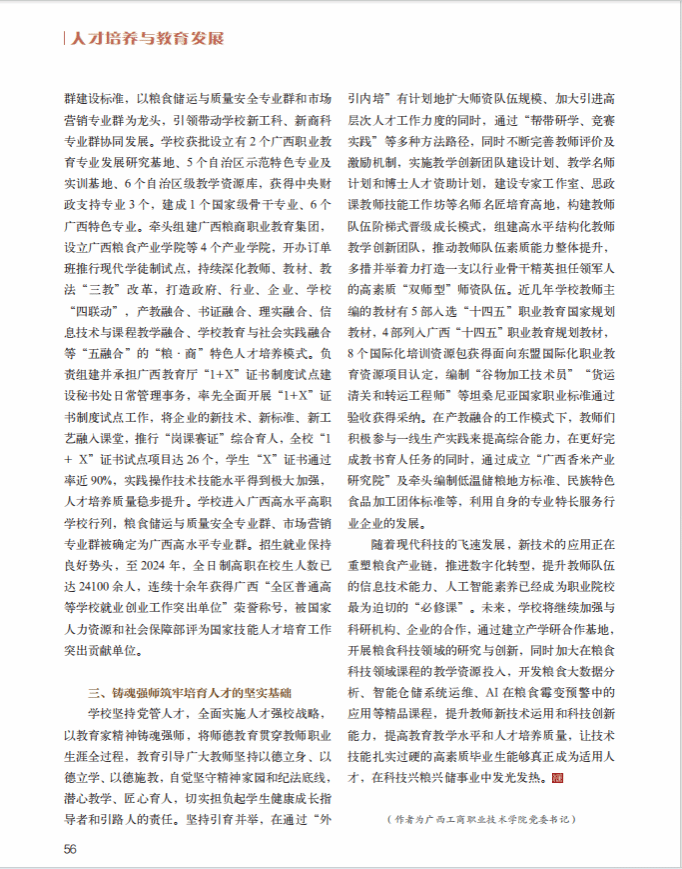 近日,《中國(guó)糧食經(jīng)濟(jì)》刊發(fā)學(xué)校黨委書(shū)記李維署名文章,標(biāo)題為《廣西工商職業(yè)技術(shù)學(xué)院:產(chǎn)教融合 科教融匯 奮力譜寫(xiě)糧安人才培養(yǎng)新篇章》,全文如下: