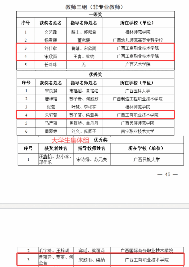 其中,在廣西第十八屆中華經(jīng)典誦讀大賽暨2025廣西校園中華經(jīng)典誦讀大賽大學(xué)生二組獲一等獎(jiǎng)1項(xiàng)、二等獎(jiǎng)1項(xiàng)、三等獎(jiǎng)4項(xiàng),教師三組(非專業(yè)教師)獲一等獎(jiǎng)2項(xiàng)、優(yōu)秀獎(jiǎng)1項(xiàng),教師三組(專業(yè)教師)獲優(yōu)秀獎(jiǎng)1項(xiàng),大學(xué)生集體組獲優(yōu)秀獎(jiǎng)1項(xiàng)。在第七屆中華經(jīng)典誦寫講大賽"詩(shī)教中國(guó)"詩(shī)詞講解大賽(廣西賽區(qū))大學(xué)教師組獲二等獎(jiǎng)1項(xiàng)、優(yōu)秀獎(jiǎng)1項(xiàng)。