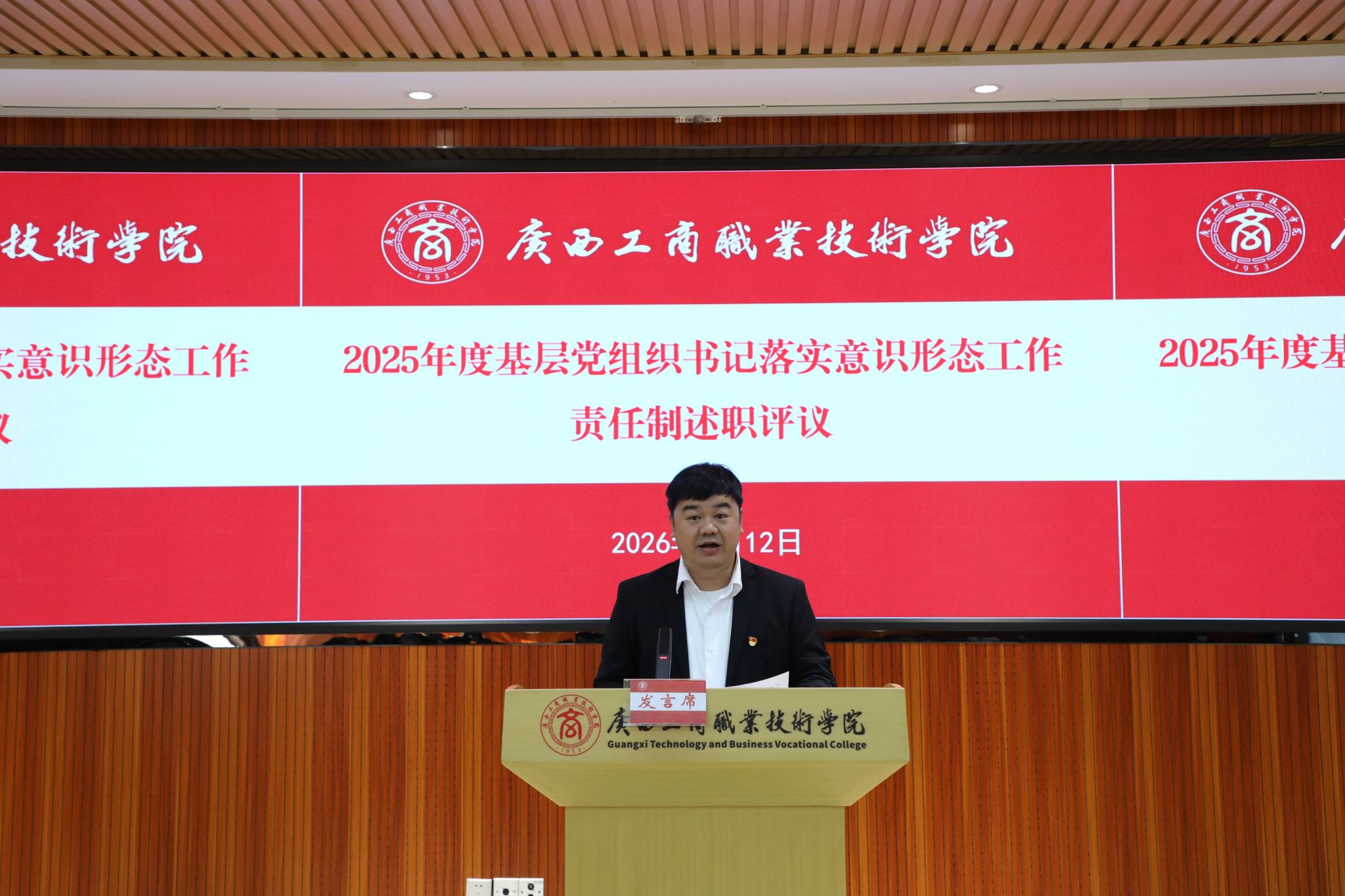 2026年1月12日上午,我校黨委以黨委擴(kuò)大會(huì)議的方式在鵬飛校區(qū)開(kāi)展2025年度基層黨組織書(shū)記抓黨建工作述職評(píng)議考核暨部門和中層管理人員年度述職評(píng)議。學(xué)校黨委委員,各黨總支、各直屬黨支部書(shū)記、委員,中層管理人員、教代會(huì)代表參加會(huì)議,學(xué)校黨委書(shū)記李維主持會(huì)議。
