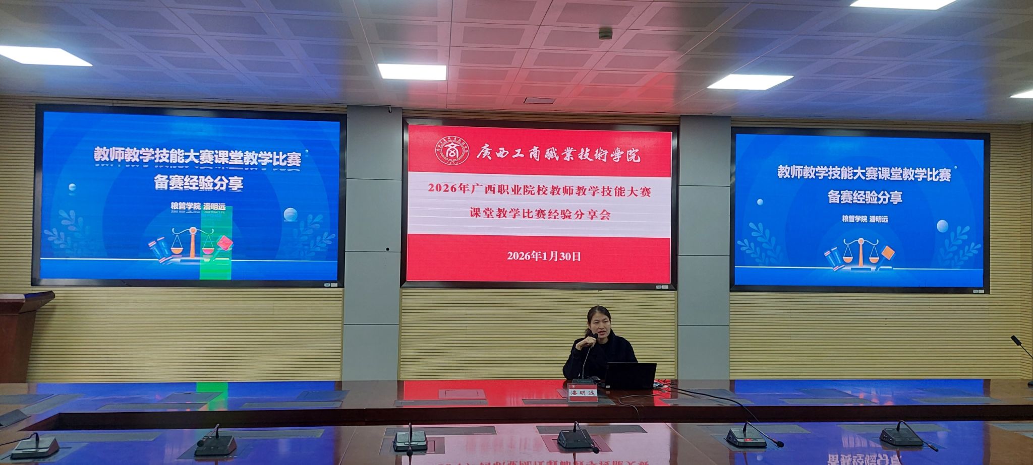 為扎實推進(jìn)2026年廣西職業(yè)院校教師教學(xué)技能大賽課堂教學(xué)比賽備賽工作,全面提升參賽作品質(zhì)量與教師教學(xué)核心能力,2026年1月30日上午,我校在鵬飛校區(qū)召開經(jīng)驗分享會。學(xué)校副校長鄭華,教務(wù)處、各二級學(xué)院主要領(lǐng)導(dǎo),參賽團(tuán)隊全體成員,以及各二級學(xué)院骨干教師代表參加了會議。