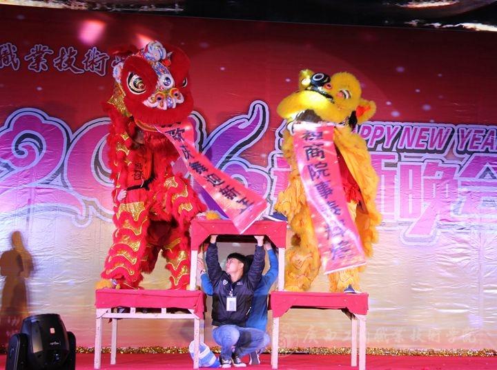 這次晚會開場首幕的是具有中國傳統(tǒng)文化特色的舞獅表演,覃武云書記為獅子現(xiàn)場“點睛”成為全場焦點,并為我院2016年許下“風調雨順”的祝語,隨著主持人對各位來賓的介紹結束,就開始了如火如荼的精彩演出,舞蹈、走秀、唱歌、啞劇、瑜伽、武術這些展示無一不激動人心。其中,楊柳老師演唱的《紅土鄉(xiāng)》,婉轉而又不失氣魄,唱出了這首歌深沉的情感;一場《人生》的舞臺劇,每一個場景的切換,都深刻突出了這場話劇的主題;一首《好好說再見》,演繹出了精彩絕倫的青春之歌;一支《雨中花》的舞蹈,用靈活而柔韌的四肢,展現(xiàn)出了雨中的感情和意境;而優(yōu)雅的舞姿后面的節(jié)目,是大伙十分期待的重頭戲,武警總隊直屬支隊剛硬的擒拿武術表演,盡顯男兒本色;表演的最后,由學院大學生藝術團以一支《see you again》,動感十足、激情似火的舞蹈結束了本場晚會。