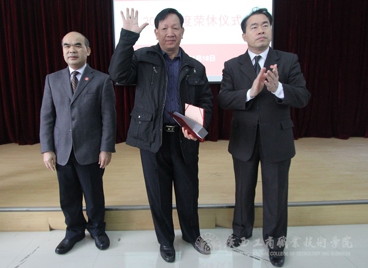 2015年度榮休儀式由黨委副書記蒙啟成主持。儀式正式開始前,與會人員集體觀看了由學院黨委宣傳部新聞中心制作的7位退休教師的榮休榜短片,回顧了老教師們的光輝歲月。學院黨委書記覃武云和學院院長陳杰為退休教職工頒發(fā)了證書以及退休紀念品,并合影留念。接著,陳杰院長發(fā)言講話,他向大家說明了榮休儀式舉辦的意義,介紹了2015年度退休教師在我院的入職及工作情況,并向老教師們?yōu)閷W院默默無聞、孜孜不倦的付出表示衷心的感謝。
