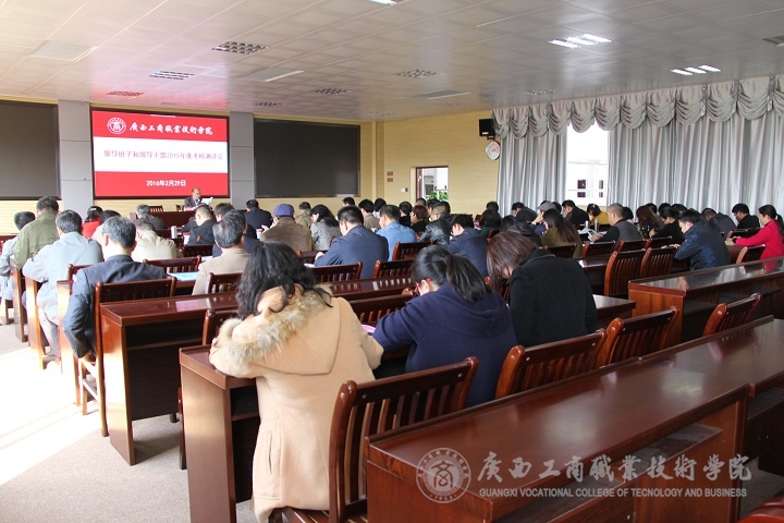 會上,覃武云書記對自治區(qū)黨委組織部關于本年度考核測評工作和具體部署要求作出了簡要的說明,并代表學院領導班子作2015年工作述職報告和2015年干部選拔任用工作報告。覃書記從三個方面作總結:1、強化理論武裝、發(fā)展三嚴三實教育、切實加強黨的建設;2、加強理論學習、切實加強思想建設;3、加強制度學習、深入推進依法治校、強化規(guī)范管理等。同時,還指出工作中存在的問題和今后努力的方向。