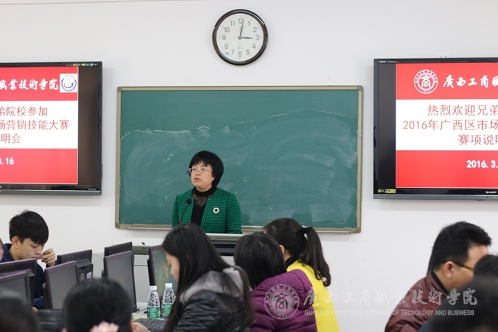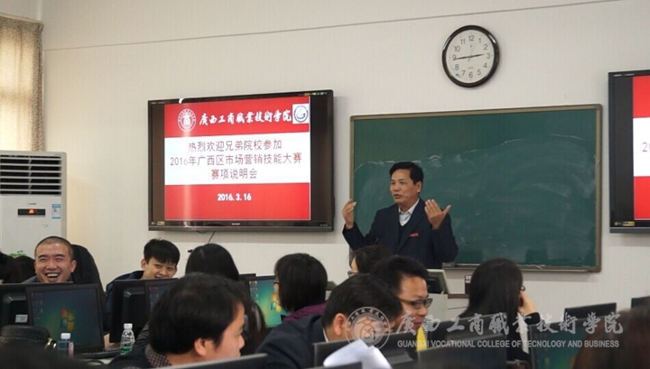 2016年3月16日14時(shí), 2016年廣西職業(yè)院校技能大賽高職組市場(chǎng)營(yíng)銷技能賽項(xiàng)說(shuō)明會(huì)在我院本部教學(xué)樓2511教室舉行。學(xué)院教務(wù)科研處處長(zhǎng)韋勝?gòu)?qiáng)教授、經(jīng)管系譚波主任、高職研究所副所長(zhǎng)葉桂中教授和來(lái)自全區(qū)大部分參賽院校領(lǐng)隊(duì)和指導(dǎo)教師、營(yíng)銷技能競(jìng)賽技術(shù)支持單位代表共40多人參加了賽項(xiàng)說(shuō)明會(huì)。
