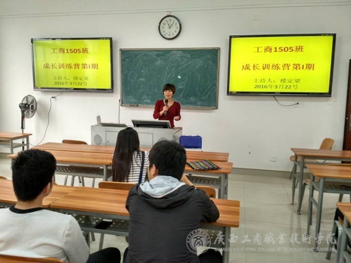 2016年3月22日上午11點在2017教室舉辦了班級成長訓練課堂的第一期,組織委員樓定梁同學主持該次活動,韋曉明、李瑋、李妙、黃秀紅、黃希霞五位同學作為第一批訓練學員。班主任李水球老師、班長余贛斌、學習委員秦玉梅、宿管委員韋柳溪、心理委員甘文廣擔任評委及其他十余位同學參與了此次訓練課堂活動。