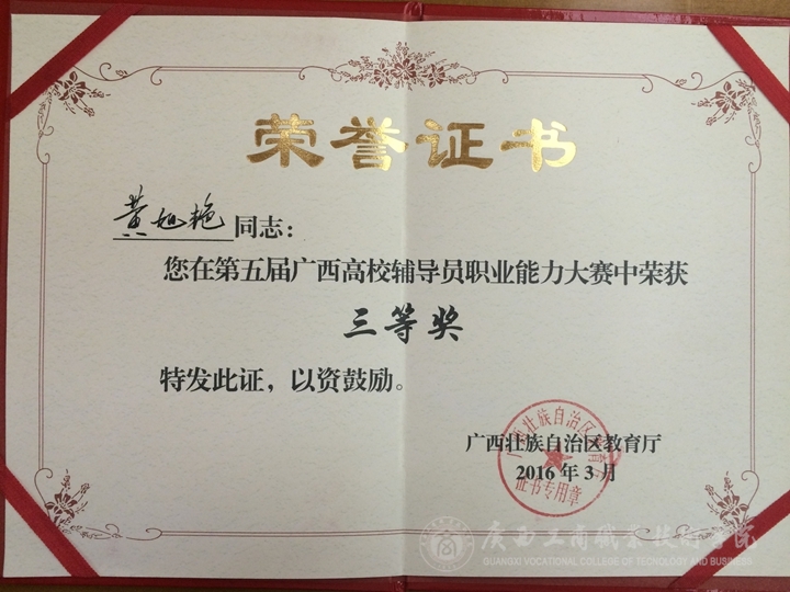 2016年3月21-23日,由自治區(qū)高校工委、自治區(qū)教育廳主辦,廣西高校輔導(dǎo)員培訓(xùn)和研修基地承辦的第五屆廣西高校輔導(dǎo)員職業(yè)能力大賽在廣西大學(xué)舉辦。來自全區(qū)60多所高校的88名輔導(dǎo)員參與大賽的角逐,在主題班會(huì)視頻、基礎(chǔ)知識(shí)測(cè)試、博文寫作、案例分析、主題演講等比賽環(huán)節(jié)中,我院黃旭艷老師憑借扎實(shí)的理論功底、過硬的專業(yè)技能和優(yōu)秀的職業(yè)素養(yǎng)獲得了三等獎(jiǎng),這也是我校目前在廣西高校輔導(dǎo)員職業(yè)能力大賽中獲得的最好成績(jī)。