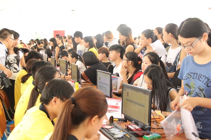 比這一切,更加鮮活熱烈的,是一張張新生們明麗的臉龐。在校門口到教學樓的這段路上,新同學們或三三兩兩,或單獨一人,或由親戚朋友陪同。報名處人滿為患,新同學們洋溢著青春的氣息,拿著錄取通知書和身份證井然有序地排著隊。家長們則在學院專設放行李的地方耐心等著自家孩子報完名。