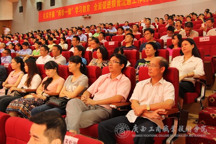為弘揚(yáng)柏鄉(xiāng)糧庫(kù)精神,深化糧食行業(yè)文化建設(shè),深入開(kāi)展“兩學(xué)一做”學(xué)習(xí)教育,9月20日,自治區(qū)糧食局邀請(qǐng)了全國(guó)糧食系統(tǒng)先進(jìn)典型——河北柏鄉(xiāng)糧庫(kù)先進(jìn)事跡宣講團(tuán)來(lái)廣西南寧宣講,我院李維副院長(zhǎng)、各單位、各部門科級(jí)以上干部代表及各系學(xué)生代表聆聽(tīng)了報(bào)告。