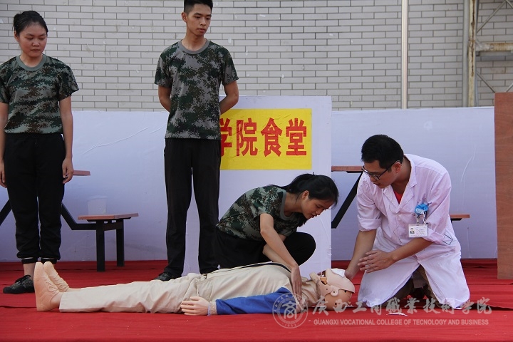體驗(yàn)完畢后,廣西民族醫(yī)院醫(yī)生陳檢為現(xiàn)場(chǎng)師生講解食物中毒、人工心肺復(fù)蘇急救知識(shí)及急救時(shí)需注意的事項(xiàng),突發(fā)事件處理方法的實(shí)踐。陳檢醫(yī)生在同學(xué)們上去演練之時(shí)手把手教學(xué),向同學(xué)們仔細(xì)的講解動(dòng)作要領(lǐng),在臺(tái)下的同學(xué)們也細(xì)心觀看,躍躍欲試。