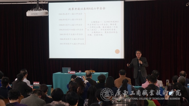 ? ? ? ? 為全面、準(zhǔn)確、深入學(xué)習(xí)貫徹黨的十八屆六中全會(huì)精神,傳達(dá)自治區(qū)第十一次黨代會(huì)精神,2016年12月20日下午,我院邀請(qǐng)自治區(qū)宣講團(tuán)成員、自治區(qū)黨委黨校副校長(zhǎng)、行政學(xué)院副院長(zhǎng)陳林杰教授到我院作學(xué)習(xí)貫徹黨的十八屆六中全會(huì)精神宣講報(bào)告。學(xué)校黨委書記覃武云主持報(bào)告會(huì)。