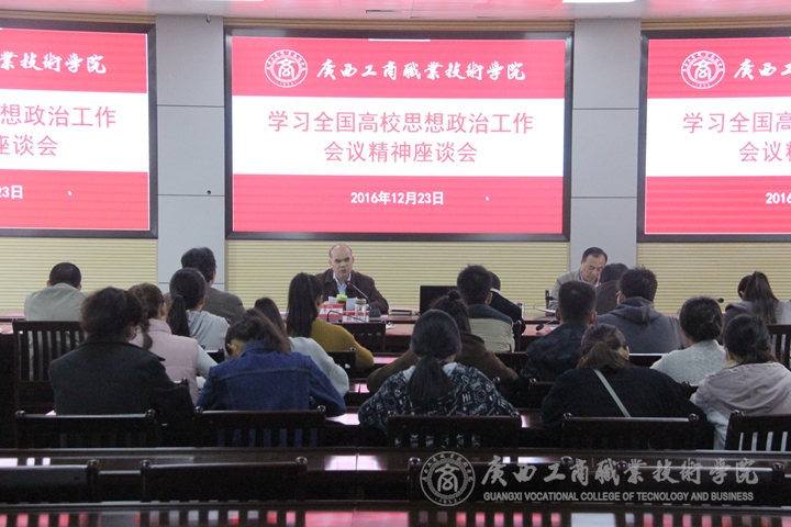 ??????? 2016 年 12 月 23 日上午,我院在校本部召開(kāi)學(xué)習(xí)全國(guó)高校思想政治工作會(huì)議精神座談會(huì)。學(xué)院黨委書(shū)記覃武云,黨委副書(shū)記、紀(jì)委書(shū)記蒙啟成出席會(huì)議。黨委組織部、黨委宣傳部、黨委學(xué)生工作部、教務(wù)科研處、后勤管理處主要負(fù)責(zé)人,各系學(xué)生代表參加了此次會(huì)議。