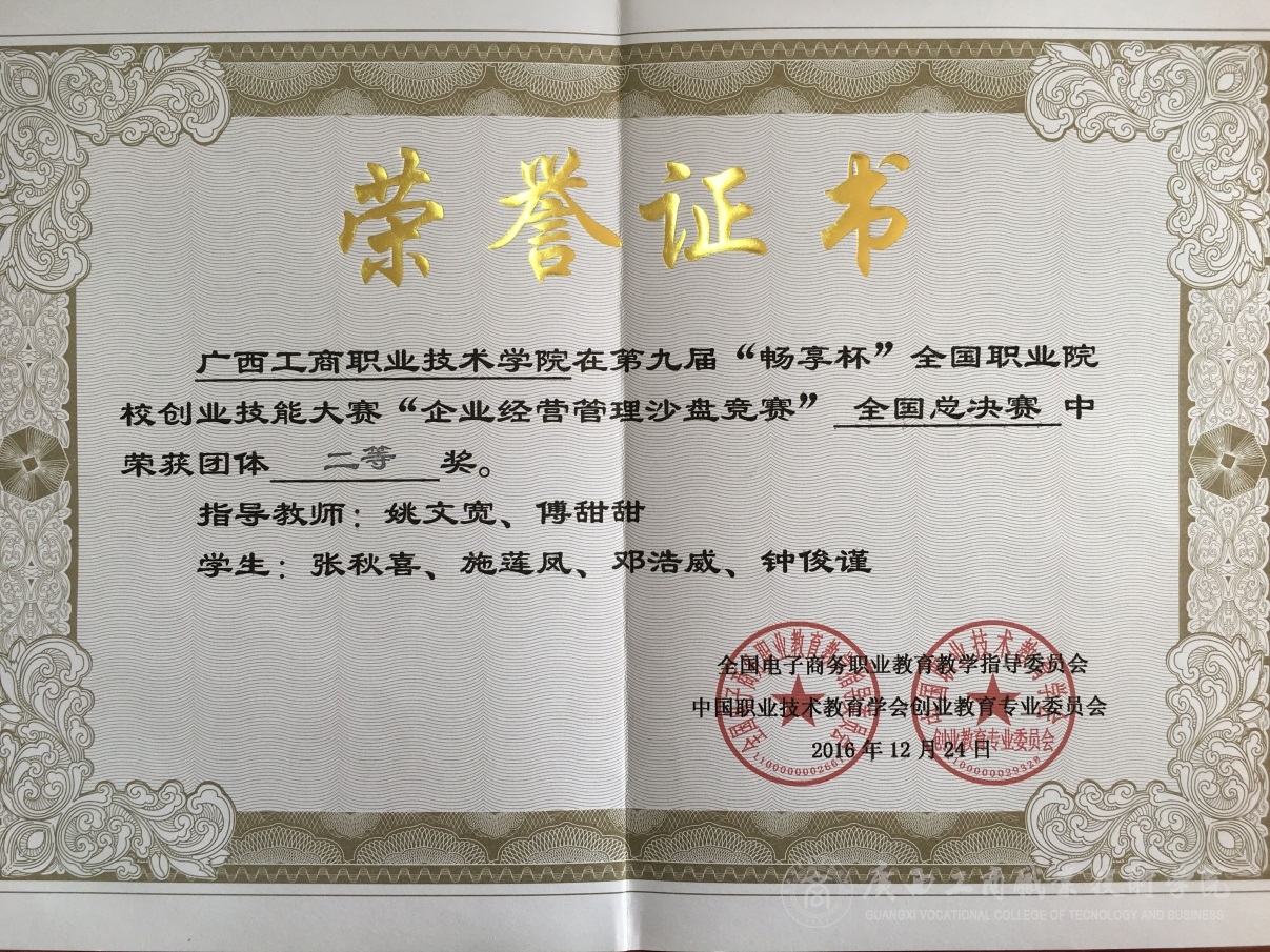 2016年12月23-25日,經(jīng)管系派出一支企業(yè)經(jīng)營管理沙盤隊(duì)伍代表學(xué)院赴山東泰安市參加第九屆“暢享杯”全國職業(yè)院校創(chuàng)業(yè)技能大賽“企業(yè)經(jīng)營管理沙盤競(jìng)賽”全國總決賽。經(jīng)過參賽隊(duì)員的奮力拼搏,我院榮獲二等獎(jiǎng)的好成績(jī)。