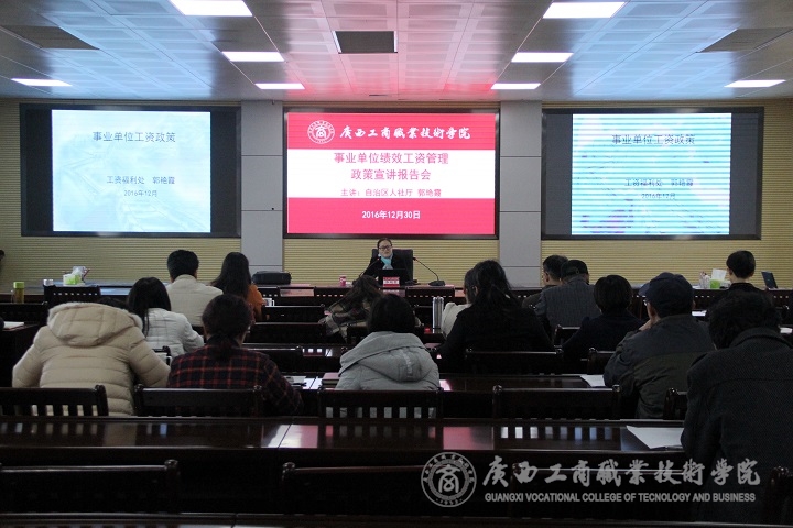 為推進我??冃ЧべY制度的實施工作,使全校教職員工更清楚地了解其方針、政策、實施辦法。2016年12月30日上午,我院事業(yè)單位績效工資管理政策宣講報告會在校本部召開。我院教師參加本次報告會。會議由自治區(qū)人力資源和社會保障廳廳郭艷霞處長、江河海科長主講。