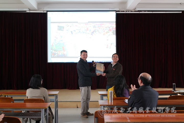 講座結(jié)束,陸瓔先生向我院贈(zèng)送《廣西民間文學(xué)作品精選》一書,希望老師和同學(xué)們能共謀民族文化遺產(chǎn)的保護(hù)和傳承之大業(yè),再現(xiàn)百越民風(fēng)盛宴。
