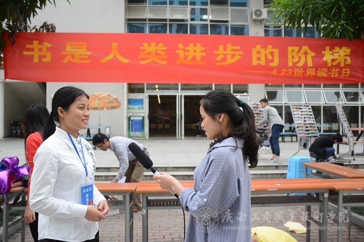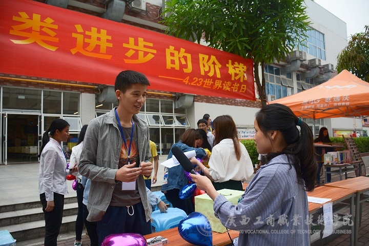 2017年4月24日中午,廣西工商職業(yè)技術(shù)學(xué)院在食堂門(mén)口舉辦了主題為“書(shū)是人類進(jìn)步的階梯”的世界讀書(shū)日活動(dòng)。新聞中心學(xué)生記者就舉辦讀書(shū)日的意義對(duì)我院學(xué)生進(jìn)行了采訪。