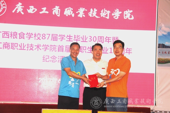 為了表達對母校和老師的感恩之心,畢業(yè)30年的87屆校友向?qū)W校贈送了禮品,時任廣西糧校校長的陳杰院長代表學校愉快接受了禮品。