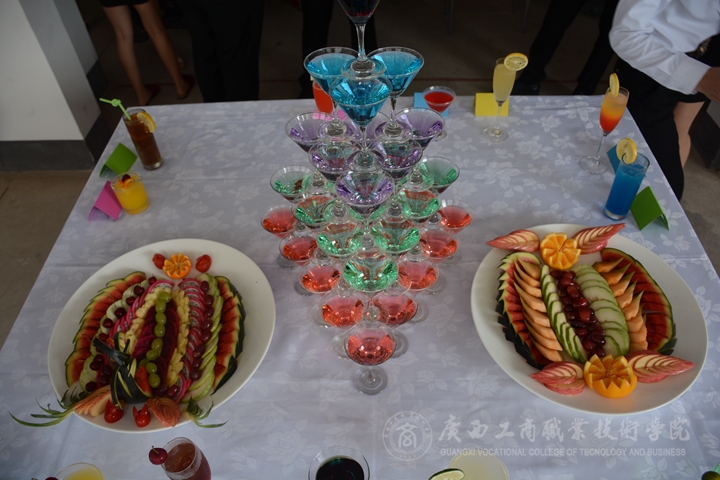 只見活動開始,調(diào)酒師們調(diào)制了五種顏色不一樣的雞尾酒,并將它們搭建成一座“金字塔”,成為展演過程中的一大亮點(diǎn),吸引了許多同學(xué)圍觀并拍照留念。