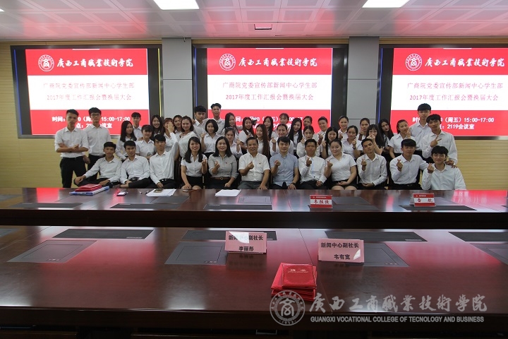 2017年6月30日下午,廣商院黨委宣傳部新聞中心學(xué)生部2017年度工作匯報(bào)會(huì)暨換屆大會(huì)在院本部召開。學(xué)院黨委副書記、紀(jì)委書記蒙啟成出席會(huì)議并講話。黨委宣傳部部長韋勝強(qiáng)、新聞中心指導(dǎo)老師莫惘、雷航,新聞中心全體成員及學(xué)院各大學(xué)生組織代表參加了本次大會(huì)。本次大會(huì)由新聞中心播主部副部長李柳娜主持。