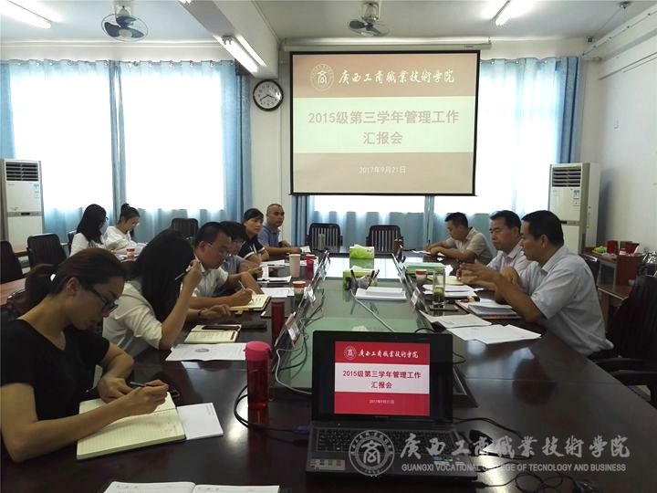 2017年9月21日下午3時,我院召開2015級第三學(xué)年管理工作匯報(bào)會。學(xué)院院長陳杰,副院長李維出席了會議。教務(wù)科研處、學(xué)生工作部相關(guān)領(lǐng)導(dǎo),各系部主任或負(fù)責(zé)頂崗實(shí)習(xí)工作領(lǐng)導(dǎo)以及各系頂崗實(shí)習(xí)秘書參加了會議。會議由李維主持。