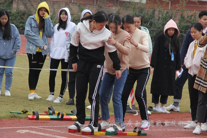 板鞋比賽上,運動員們在起跑線上全神貫注地等待發(fā)令聲響起,賽道周圍擠滿了前來加油助威的各系拉拉隊,他們充滿激情的吶喊聲縈繞在整個田徑場中。隨著發(fā)令聲響起,運動員們板鞋拍打跑道的聲音有節(jié)奏地響起,運動員們配合默契,不停地喊著“一二一,一二一”“左右左,左右左”的口號,雙臂快速而有力地揮動著,在賽道上大步前行,以整齊的步伐向終點邁去。跑道濕滑,運動員們一次次的摔倒,又一次次的爬起,堅持不懈,不到終點不罷休。