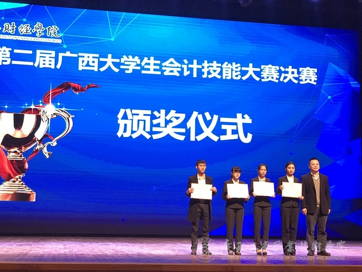 ? ? ? ? 2017年12月25日,由廣西壯族自治區(qū)教育廳主辦,廣西財經(jīng)學院承辦的第二屆廣西大學生會計技能大賽決賽在廣西財經(jīng)學院順利舉行。經(jīng)過歷時一個月的初賽、復賽選拔,本科組和高職高專組各有來自7所高校的7支隊伍組最終晉級決賽。在我院會計系盧海妮、文玉蘭、廖晶和班藝芹4位老師的指導和帶領下,會計系2016級葉鳳、黃瑞琪和2017級黃秋珊、易婷婷4名學生組成隊伍前往參賽。經(jīng)過激烈角逐,我院代表隊在本次大賽中榮獲二等獎。