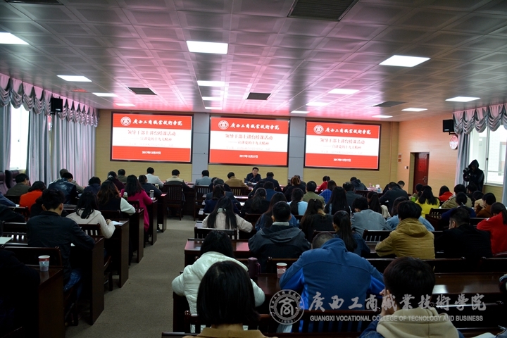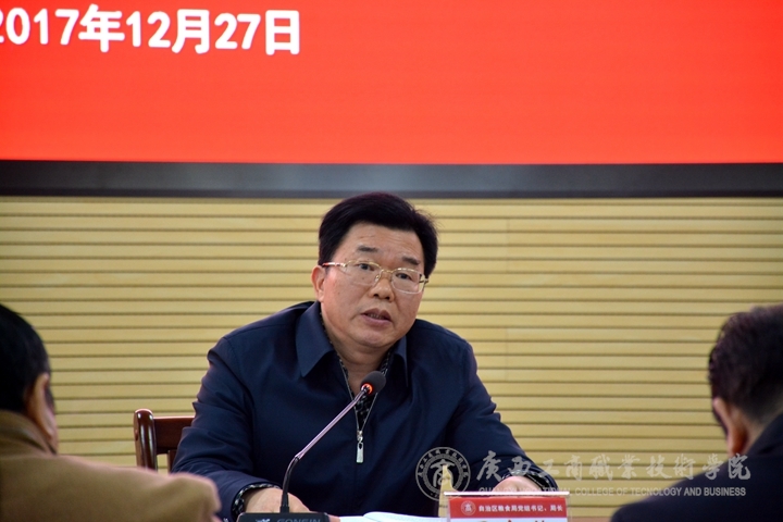 12月27日上午,2017年廣西領(lǐng)導(dǎo)干部上講臺(tái)開(kāi)展思想政治教育報(bào)告會(huì)在我院校本部舉行。自治區(qū)糧食局黨組書(shū)記、局長(zhǎng)吳宇雄同志作學(xué)習(xí)黨的十九大精神宣講報(bào)告。報(bào)告會(huì)由學(xué)院黨委副書(shū)記、院長(zhǎng)陳杰主持,黨委副書(shū)記、紀(jì)委書(shū)記蒙啟成、副院長(zhǎng)李仕欽出席報(bào)告會(huì)。