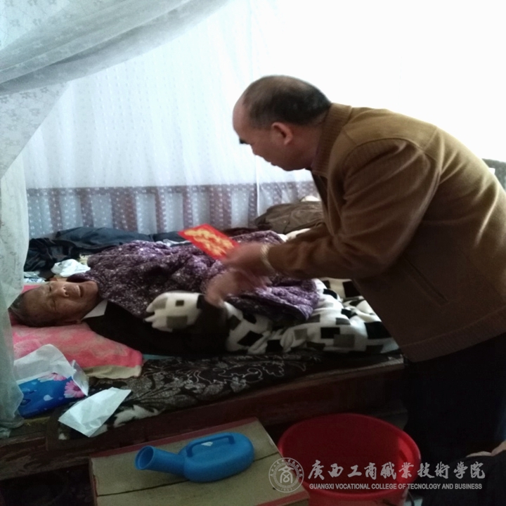 ? ? ? ??學(xué)院黨委書(shū)記覃武云、組織部長(zhǎng)蔣百平一行到家看望慰問(wèn)我院高齡老人梁惠忠、學(xué)院老領(lǐng)導(dǎo)黃永蓬同志。并與老同志及其家人親切交談,感謝老同志長(zhǎng)期以來(lái)對(duì)學(xué)院發(fā)展做出的貢獻(xiàn),希望他們今后一如既往地關(guān)注支持學(xué)院事業(yè)發(fā)展,并向他們致以新年祝福。
