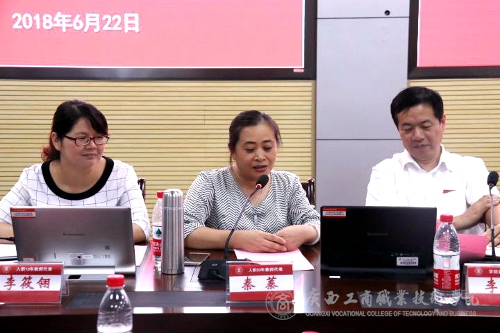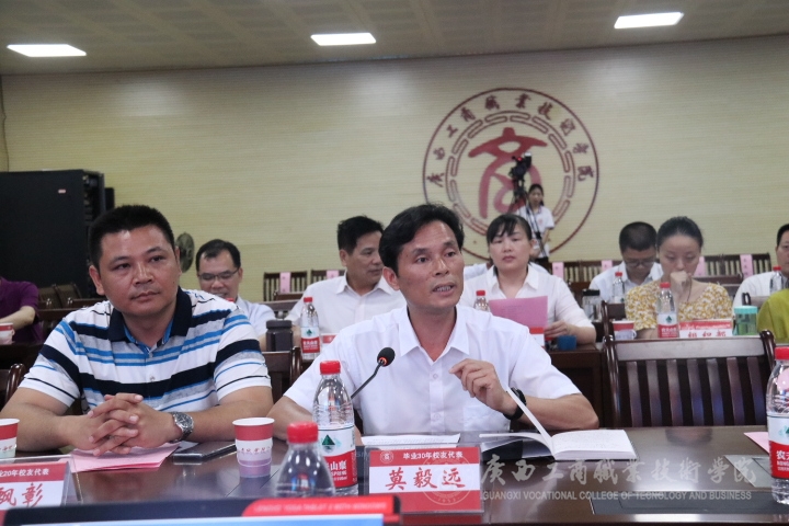 ? ? ? ? ?6月22日下午,廣西工商職業(yè)技術(shù)學(xué)院在鵬飛校區(qū)會議廳舉辦學(xué)院發(fā)展座談會。廣西工商職業(yè)技術(shù)學(xué)院黨委書記覃武云、院長陳杰、黨委副書記蒙啟成、副院長李仕欽、副院長李維、副院長陳寧春出席會議,學(xué)院各部門、各單位主要負(fù)責(zé)人、校友辦、各系系校友組全體人員、四個年代校友代表(畢業(yè)30年、20年、10年、今年)、 四個年代入職教師代表(入職 30 年、20 年、10 年、今年)參加會議。 座談會由院長陳杰主持。會上,陳杰介紹了參會人員,并對返校的畢業(yè)校友代表及教師代表的到來表示熱烈歡迎。緊接著,覃武云向大家簡要通報學(xué)院改革發(fā)展情況,主要講三方面情況。