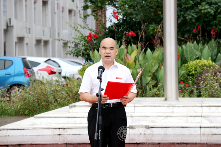 升旗儀式由學(xué)院領(lǐng)導(dǎo)副院長(zhǎng)陳寧春主持,學(xué)院黨委書記覃武云在國(guó)旗下發(fā)表新學(xué)期開學(xué)講話。