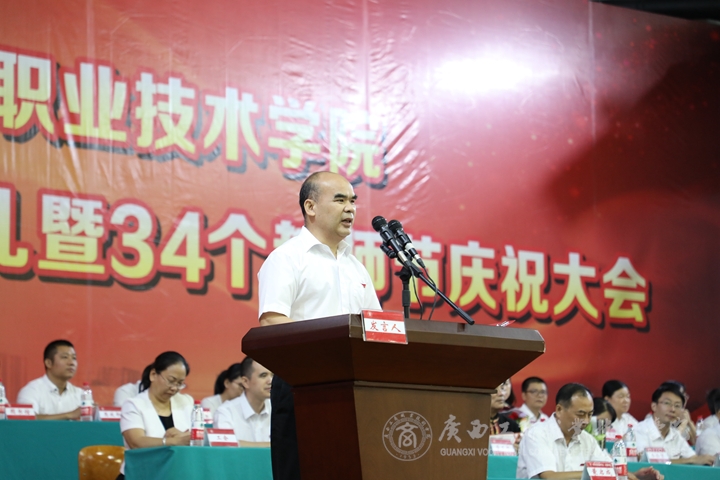 金秋九月,天朗氣清。2018年9月10日上午,學院于鵬飛校區(qū)文體館二樓舉行2018級新生開學典禮暨第34個教師節(jié)慶祝大會。學院黨委書記覃武云、院長陳杰、黨委副書記、紀委書記蒙啟成、副院長李仕欽、副院長李維、副院長陳寧春,各部門、各單位主要負責人、2018級輔導員、班主任、長期帶班和突出貢獻教職工,2018級全體新生等參加了本次會議。本次大會由學院副院長陳寧春主持。