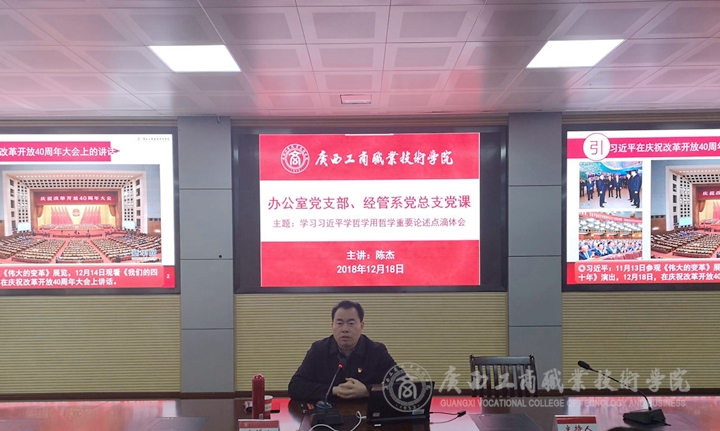2018年12月18日下午,學(xué)院院長(zhǎng)陳杰同志在2119視頻會(huì)議室為辦公室黨支部、經(jīng)管系黨總支上黨課。此次黨課由辦公室黨支部書(shū)記覃遠(yuǎn)霞主持,辦公室黨支部全體黨員、經(jīng)管系黨總支教師黨員、學(xué)生黨員及入黨積極分子參加了此次黨課的學(xué)習(xí)活動(dòng)。