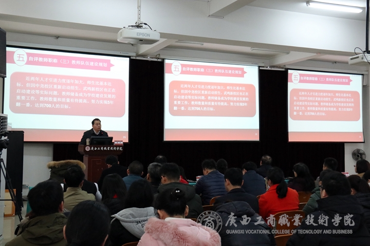 2019年1月11日,學(xué)院于鵬飛校區(qū)2145報(bào)告廳召開(kāi)2018—2019學(xué)年第一學(xué)期期末大會(huì),學(xué)院黨委書(shū)記覃武云、院長(zhǎng)陳杰、黨委副書(shū)記、紀(jì)委書(shū)記蒙啟成、副院長(zhǎng)李仕欽、副院長(zhǎng)陳寧春出席,各部門(mén)、各單位負(fù)責(zé)人、全體教職工參加了會(huì)議。本次會(huì)議由覃武云書(shū)記主持。