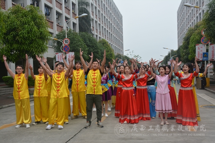 ? ? ? ?3月19日上午,我院學(xué)生藝術(shù)團(tuán)、音樂(lè)協(xié)會(huì)、禮儀隊(duì)等學(xué)生代表在廣商院鵬飛校區(qū)校園主干道開(kāi)展“壯族三月三”唱壯歌快閃活動(dòng)。