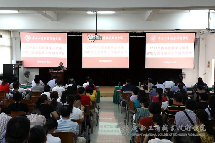 ? ? ? ? 為順利迎接學(xué)院內(nèi)部質(zhì)量保證體系診斷與改進(jìn)復(fù)核工作,2019年6月18日下午,我院于鵬飛校區(qū)教學(xué)樓報(bào)告廳召開2019年內(nèi)部質(zhì)量體系診斷與改進(jìn)復(fù)核工作動(dòng)員大會(huì),學(xué)院黨委書記覃武云、院長(zhǎng)李維、黨委副書記、紀(jì)委書記蒙啟成出席了本次會(huì)議,全體中層干部、各系部全體教師、教務(wù)科研處、黨委教師工作部、黨委學(xué)生工作部、評(píng)估督導(dǎo)室、現(xiàn)代教育技術(shù)中心相關(guān)人員參加了本次會(huì)議。本次大會(huì)由黨委書記覃武云主持,院長(zhǎng)李維在會(huì)上做動(dòng)員講話。?