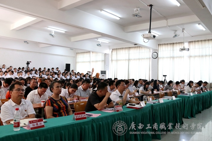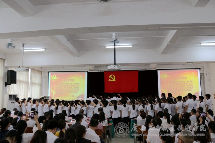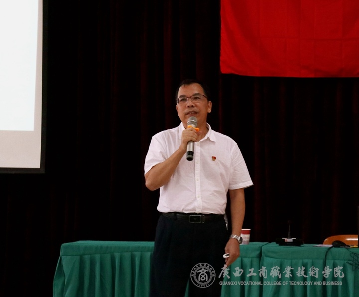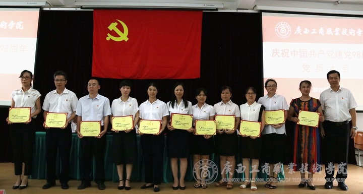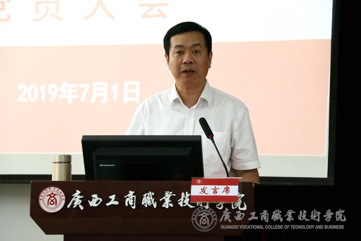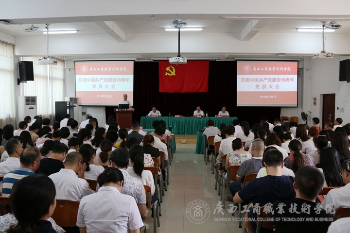? ? ? ? 7月1日下午,為深入學習宣傳貫徹習近平新時代中國特色社會主義思想和黨的十九大精神,做好“不忘初心、牢記使命”主題教育籌備工作,推進學院2019年黨建重點工作部署,增強黨的凝聚力和戰(zhàn)斗力,? 我院于鵬飛校區(qū)教學樓會議室召開中共廣西工商職業(yè)技術(shù)學院委員會慶祝中國共產(chǎn)黨建黨98周年黨員大會。學院全體在職教職工黨員、離退休教職工黨員代表、新入黨學生黨員、教職工入黨積極分子參加本次會議。會議由黨委副書記、紀委書記蒙啟成同志主持。