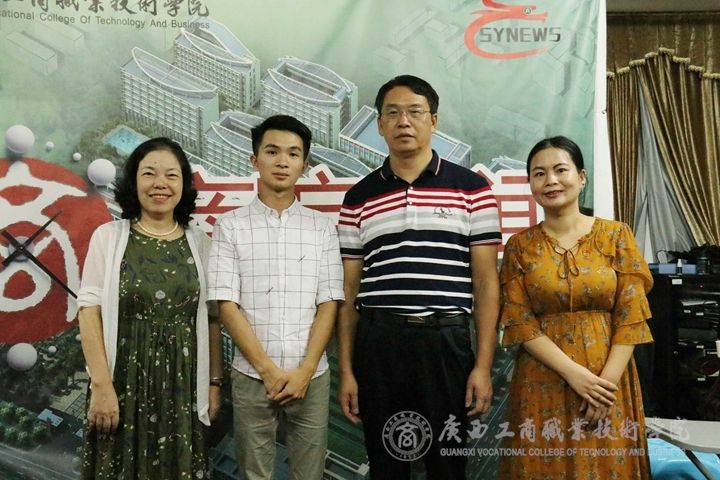 (自治區(qū)糧儲(chǔ)局調(diào)研員冼一紫、廣西工商技師學(xué)院校長(zhǎng)助理黃斌、黃斌同學(xué)與新聞中心指導(dǎo)老師莫惘合影)