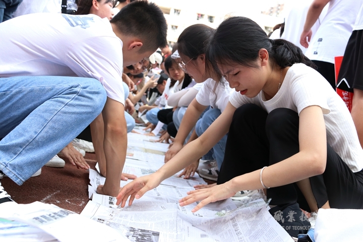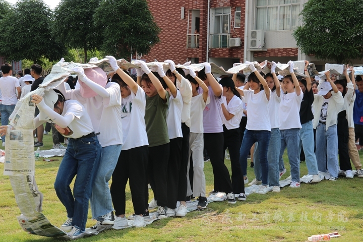 ? ? ? ? 緊接著第二個游戲“無敵風火輪”,以分配足夠的報紙、膠帶、剪刀,用不同的方法將報紙一張張粘貼起來,必須動作迅速,完成后所有成員都要進去,保持大家的步伐一致,同時報紙不能破損,這考驗著各班同學的組織、協(xié)調(diào)能力以及指揮者一絲不茍的工作態(tài)度;