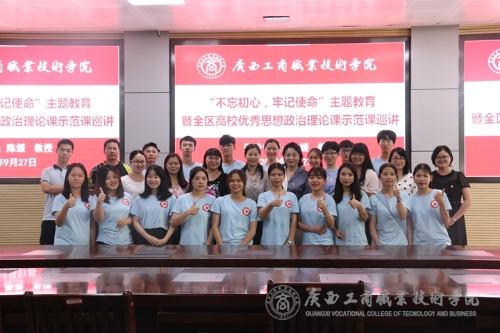 ??????? 2019年9月27日上午,思政部在校本部鵬飛校區(qū)視頻會議室開展“不忘初心、牢記使命”主題教育暨全區(qū)高校優(yōu)秀思想政治理論課示范課巡講活動。本次活動由思政部劉萬英教授主持,思政部教師、2018級“思政沙龍”學(xué)生、系部學(xué)生代表共120余人參加。
