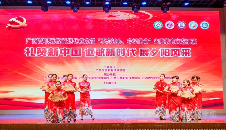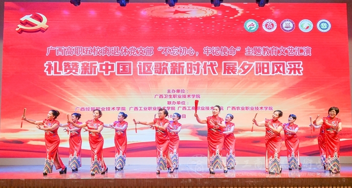 ??????? 金秋時節(jié),美在身邊。10月28日晚,我院與廣西衛(wèi)生職業(yè)技術(shù)學院、廣西經(jīng)貿(mào)職業(yè)技術(shù)學院、廣西工業(yè)職業(yè)技術(shù)學院、廣西農(nóng)業(yè)職業(yè)技術(shù)學院等五所高職院在廣西衛(wèi)生職業(yè)技術(shù)學院學術(shù)報告廳共同舉辦離退休同志“不忘初心、牢記使命”主題教育文藝匯演。學院黨委副書記蒙啟成、廣西衛(wèi)生職業(yè)技術(shù)學院黨委書記李超乾、廣西經(jīng)貿(mào)職業(yè)技術(shù)學院黨委副書記杜遠陽、老年日報廣西聯(lián)絡站長陳成光等領導嘉賓出席活動,有200多名老同志參加了活動。
