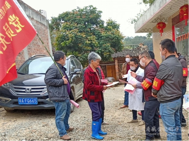 “疫情就是命令!”學院派往陸川縣的第一書記們匆匆結(jié)束春節(jié)假期,返回駐守村開展防疫工作,他們克服村居道口分散的困難,快速完成道路設(shè)卡排查,安排人員24小時輪流值守。迅速組織隊伍入戶做疫情檔案登記、張貼標語、拉橫幅、發(fā)放防疫宣傳單等,提醒村民做好防護措施,做到宣傳、排查全覆蓋,確保不漏一戶一人。