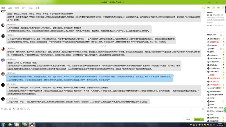 3月9日下午,會計系組織全體師生通過電腦、手機、筆記本等平臺相聚云端,認真觀看由教育部社科司與人民網聯(lián)合組織的“全國大學生同上一堂疫情防控思政大課”網絡直播,并在各班級開展線上主題班會,積極分享彼此的聽課感受。