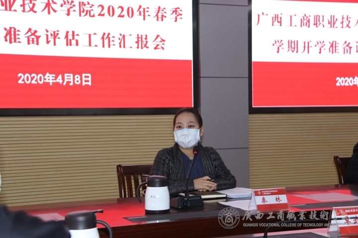 2020年4月8日上午,學(xué)院召開2020年春季學(xué)期開學(xué)準(zhǔn)備評(píng)估工作匯報(bào)會(huì)和反饋會(huì),自治區(qū)直屬高校開學(xué)評(píng)估工作第十五組組長(zhǎng)、自治區(qū)糧食和物資儲(chǔ)備局人事處副處長(zhǎng)秦林,評(píng)估組成員、廣西質(zhì)量技術(shù)工程學(xué)校副校長(zhǎng)陳正剛和環(huán)境衛(wèi)生與地方病防制所主任醫(yī)師黃林蒞臨我院開展開學(xué)準(zhǔn)備評(píng)估工作。我院全體學(xué)院領(lǐng)導(dǎo)和開學(xué)工作組負(fù)責(zé)人、部分成員參加了會(huì)議。